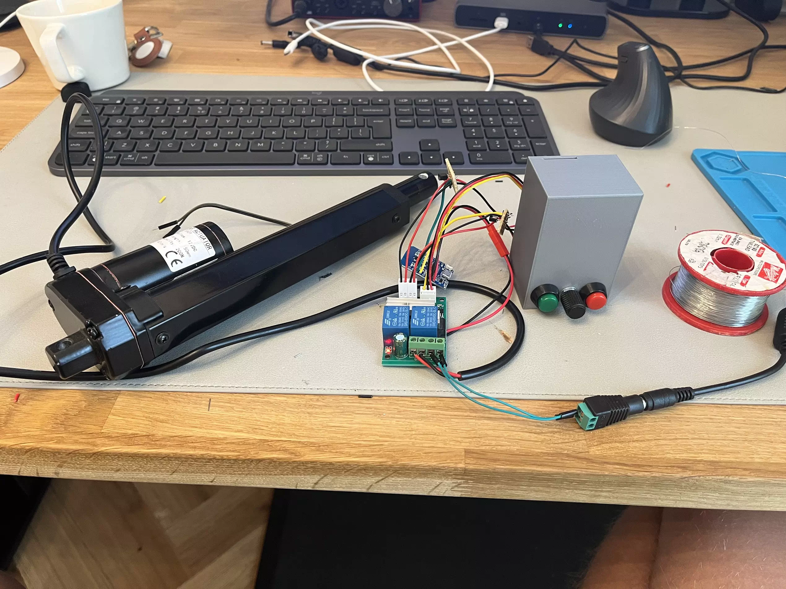 There are two relays on the motor controller. One relay moves the actuator up the other one down. To make it work properly I had to interlock the relays so that it would not be possible to trigger both of the relays as the same time and add a delay so that after the relay has done its job it should turn off. The motor controller lets you choose the speed of the actuator movement as well, so it’s not deterministic, but I found that 7 seconds is enough to open/close the window at any speed.